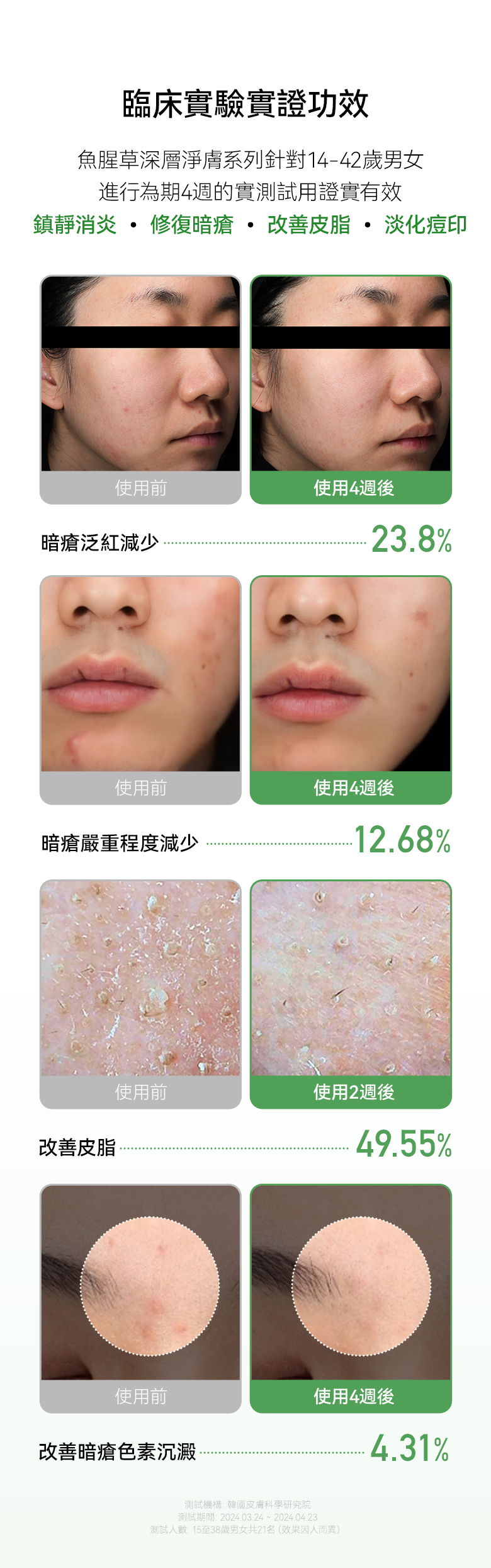 🌿 暗瘡改善13.4%,有效舒緩炎症並撫平暗瘡與暗粒